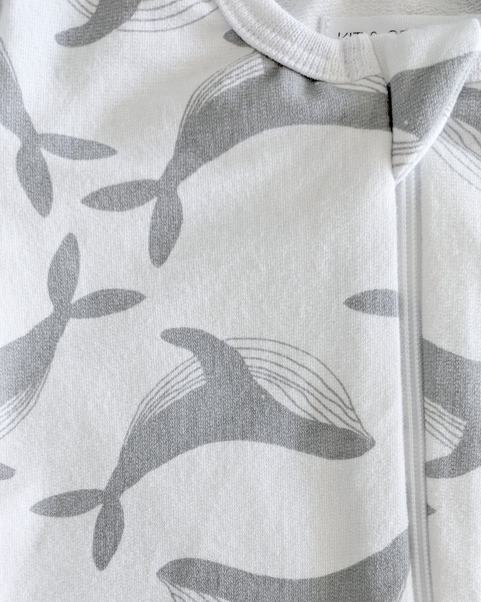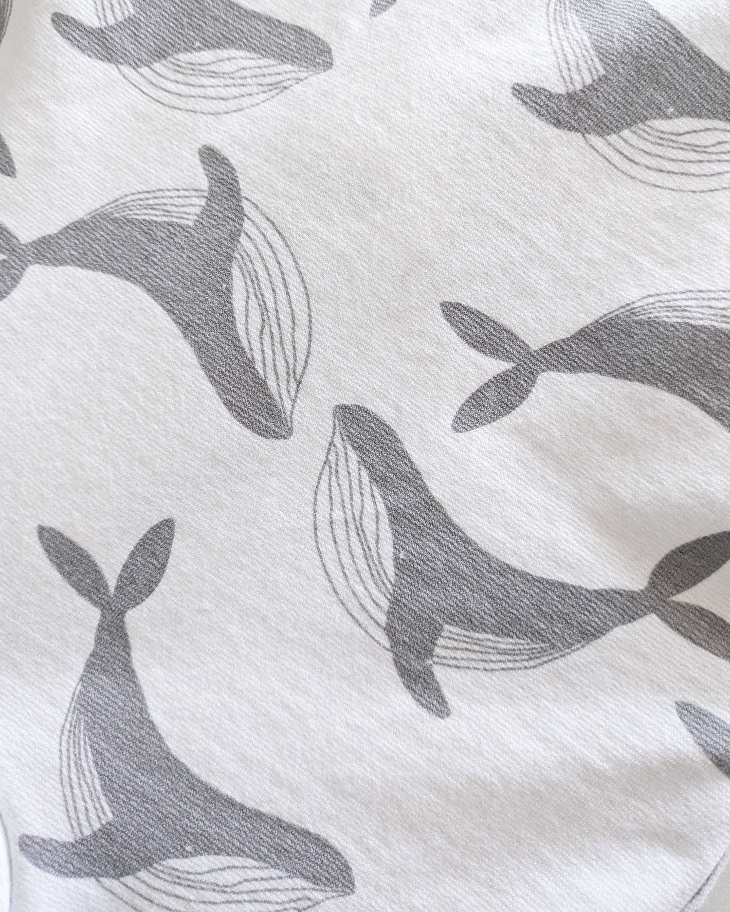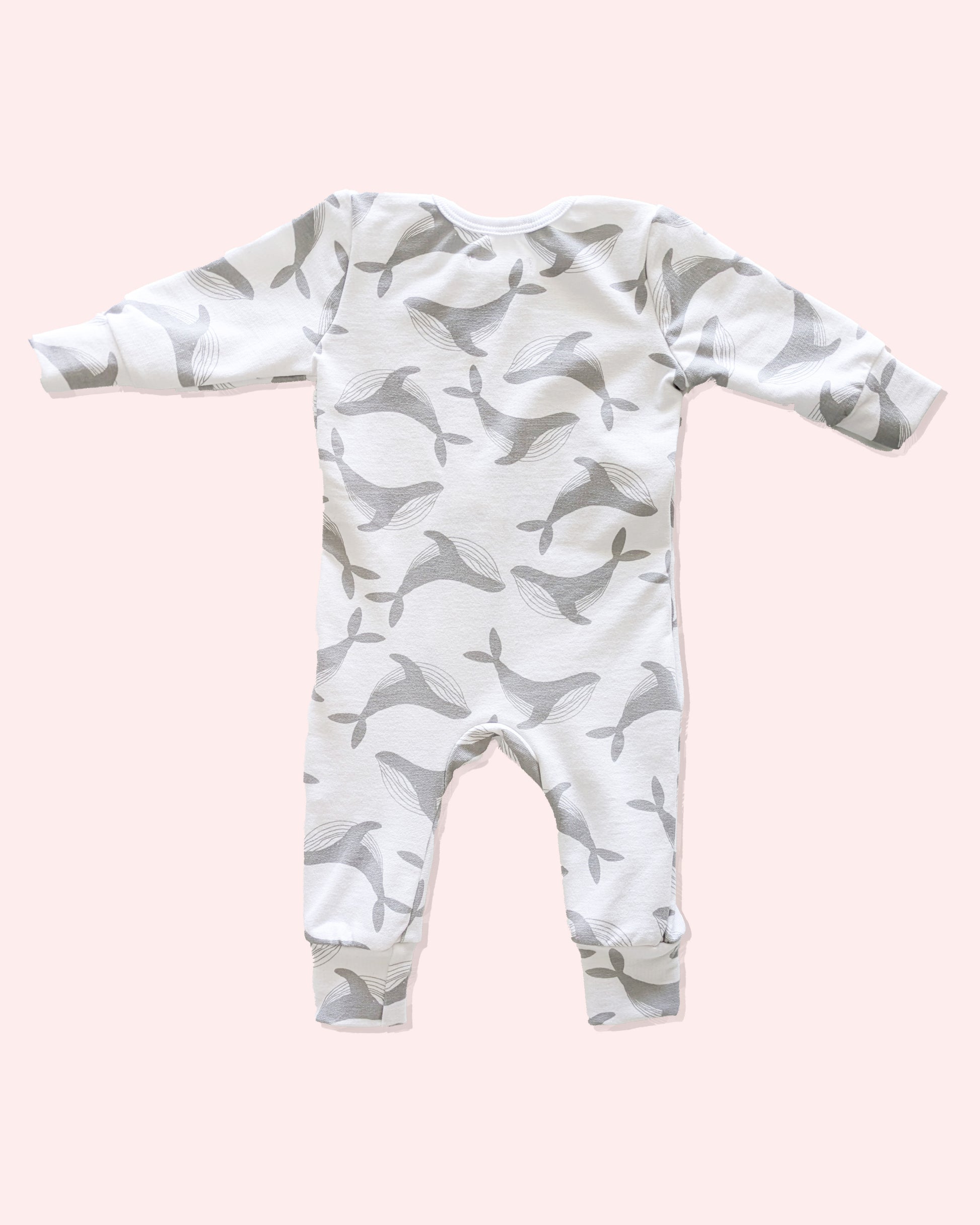 The grey Whale full bodysuit is printed on a beautifully super soft and cosy brushed cotton, perfect for babies and children.