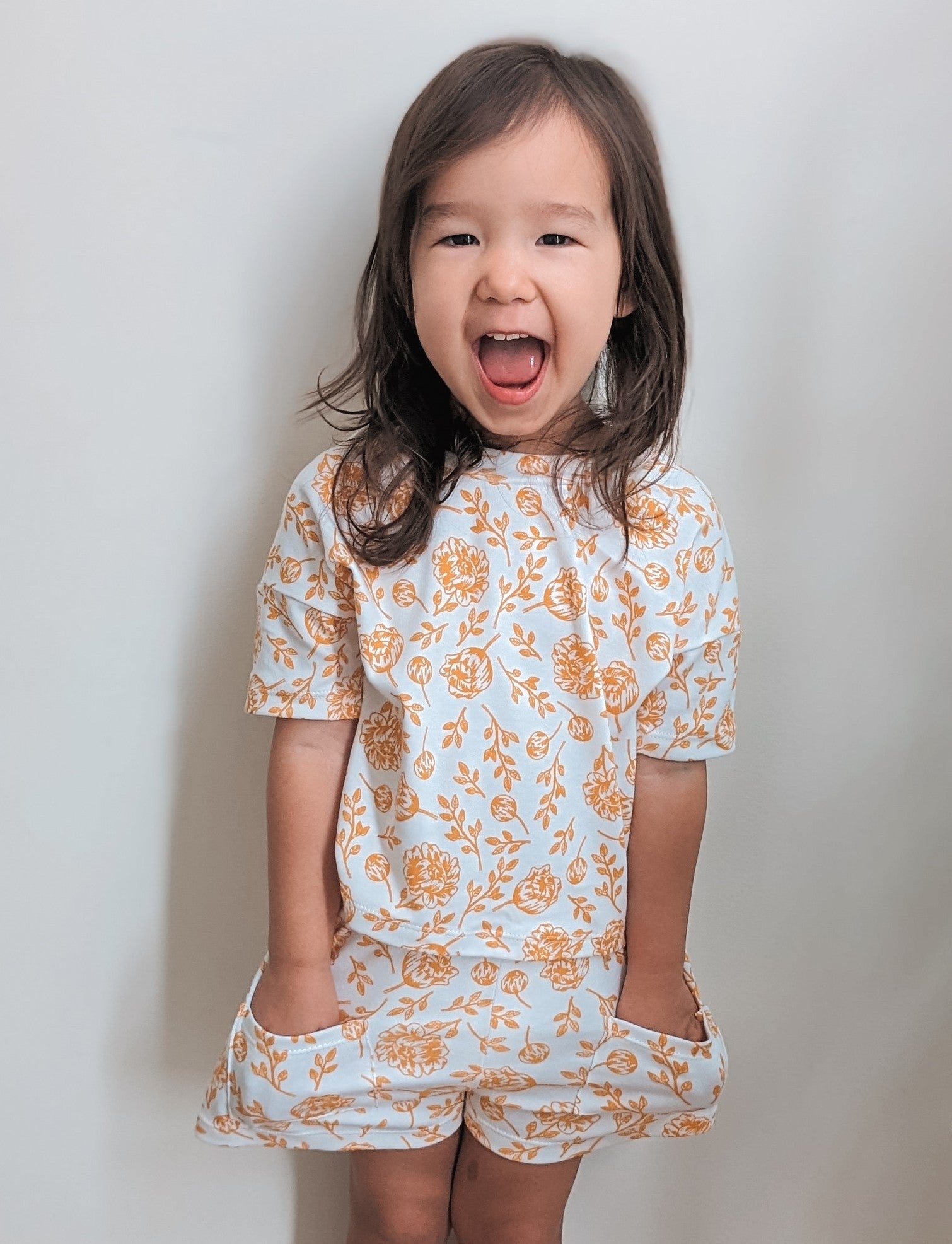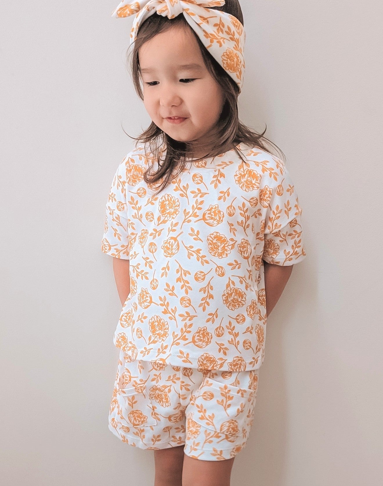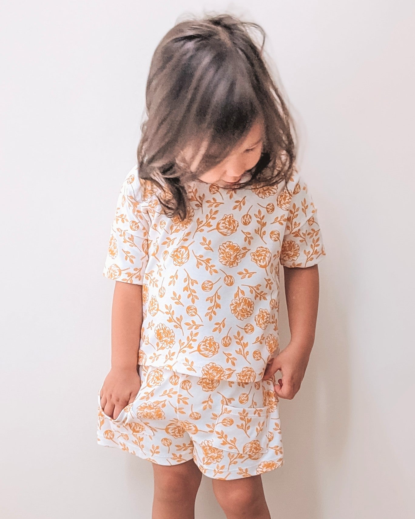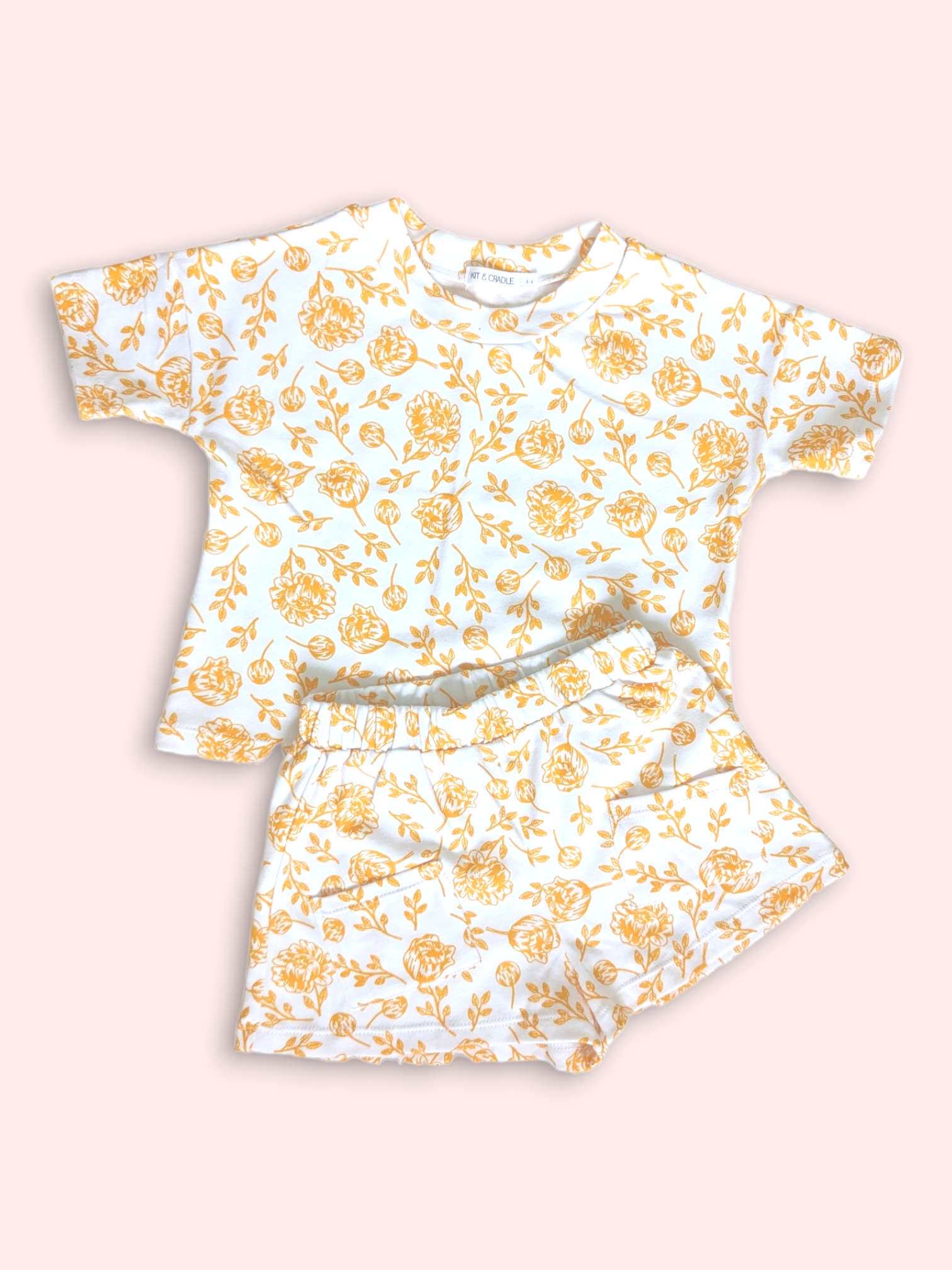 This t-shirt and shorts set is the perfect wardrobe staple. Soft and comfortable, made from organic cotton, this set features a drop shoulder t-shirt and wide-legged, shorts with an elastic waistband and cut patch pockets.